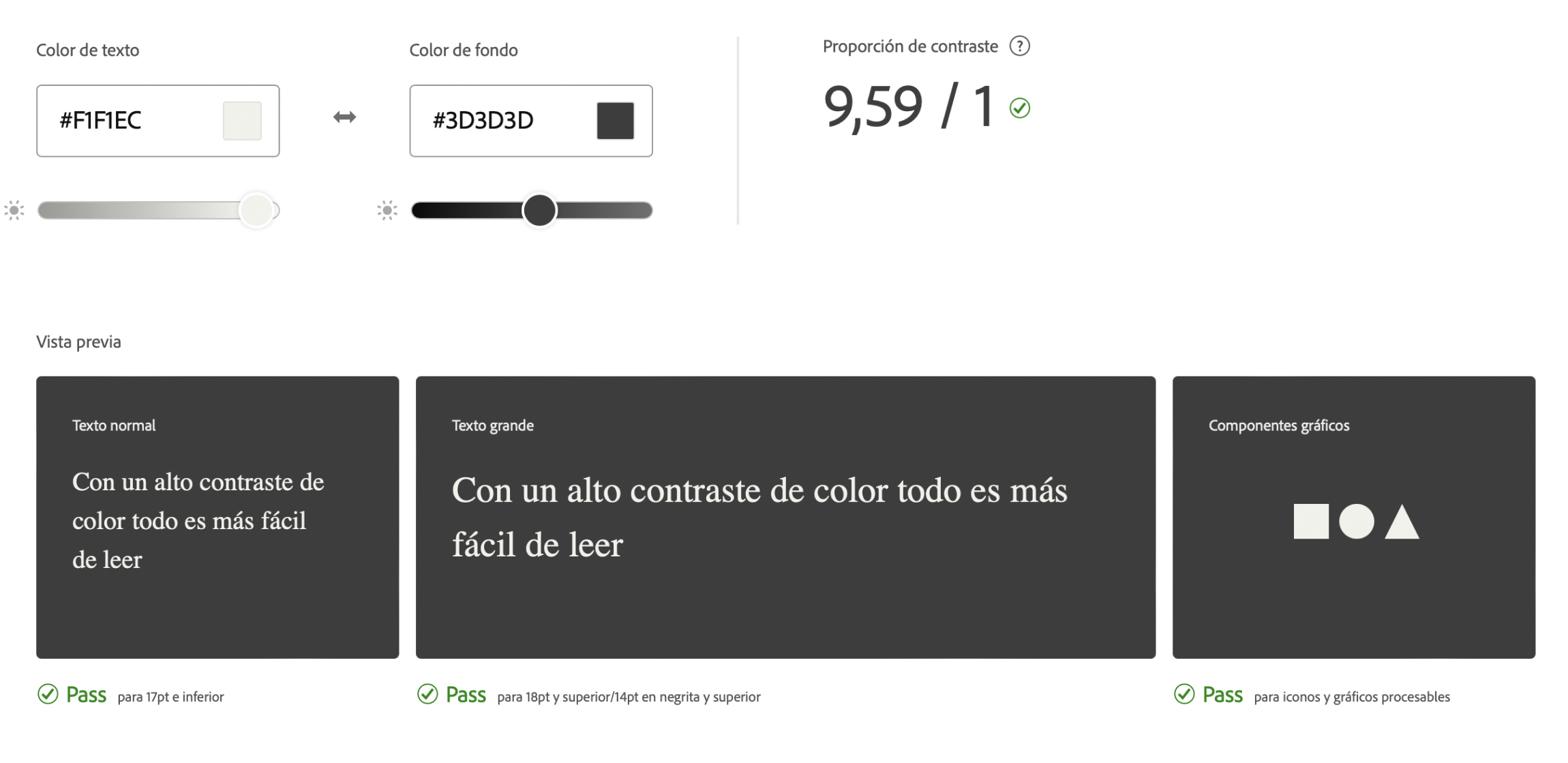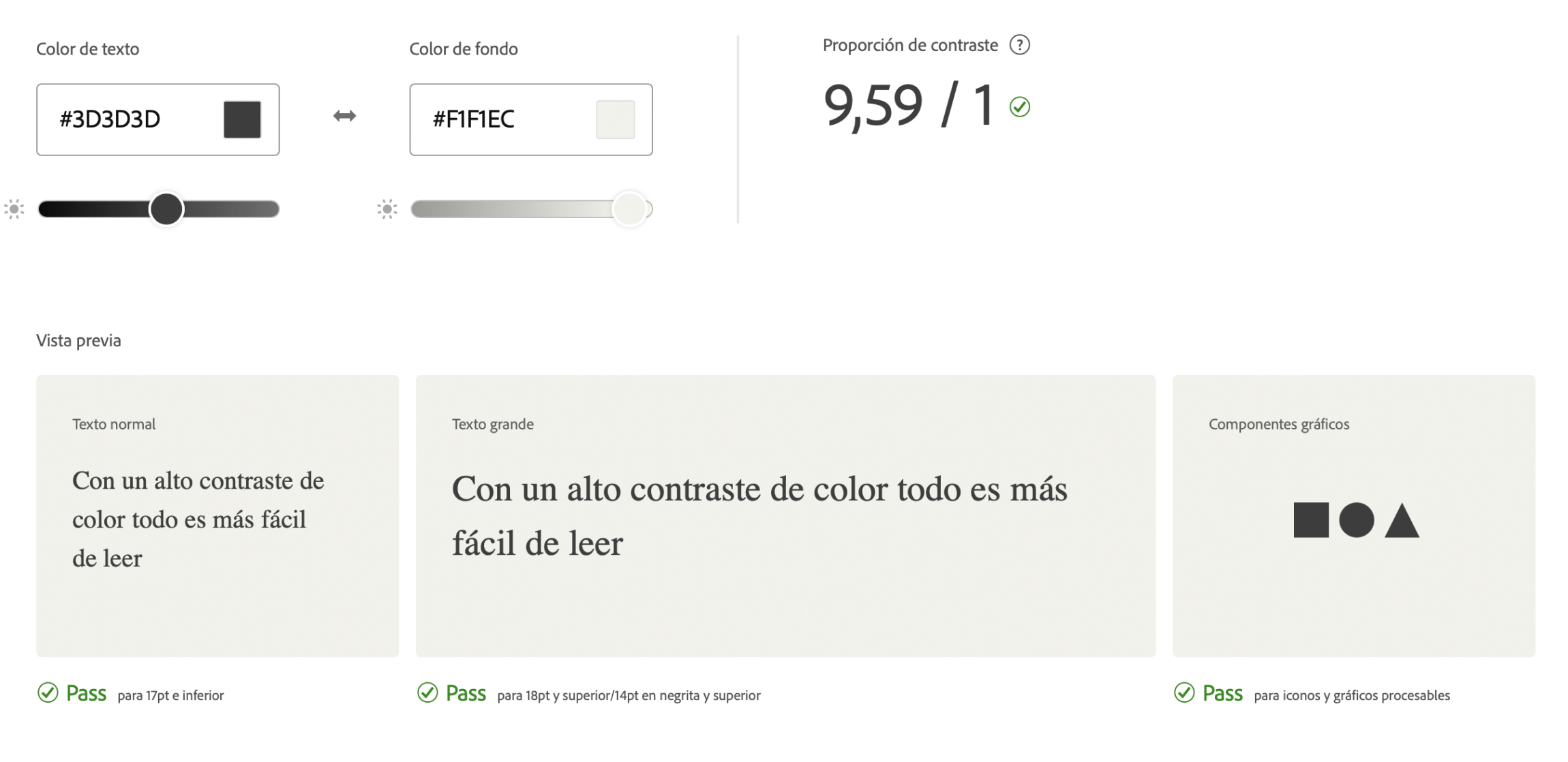 We analyzed the color contrasts through colour.adobe.com aiming for AAA, to make sure they are accessible to the majority of the population.