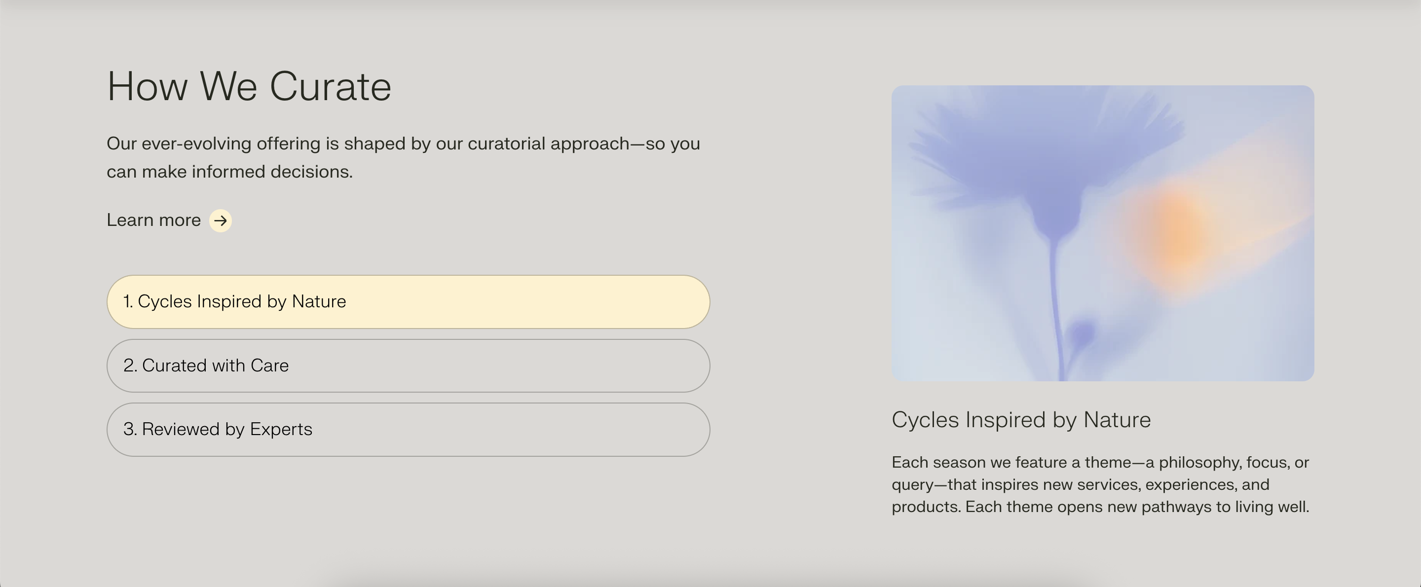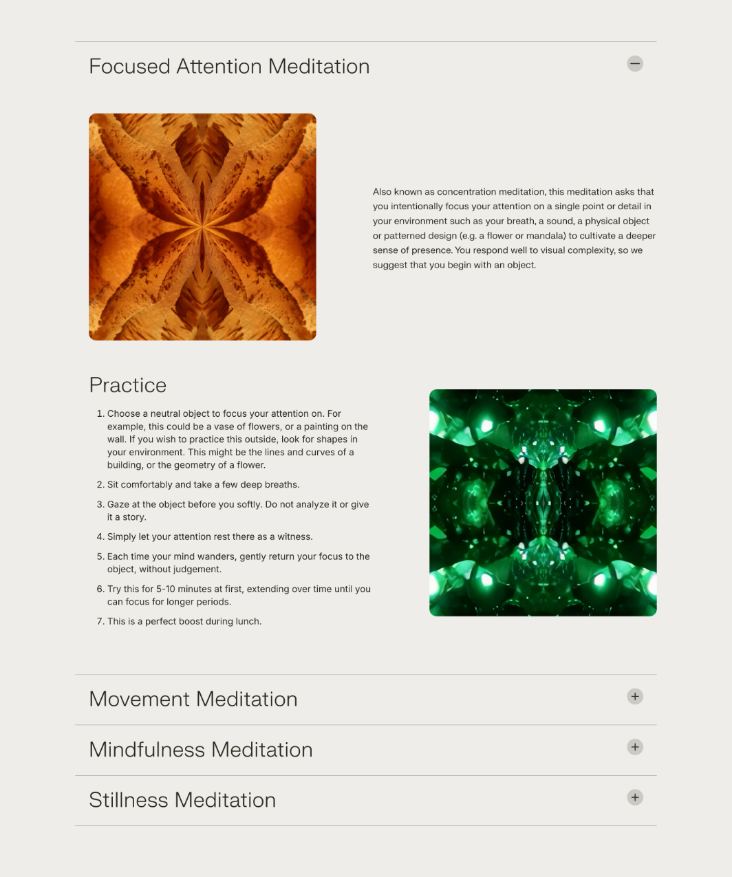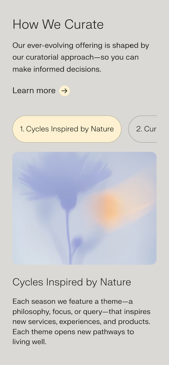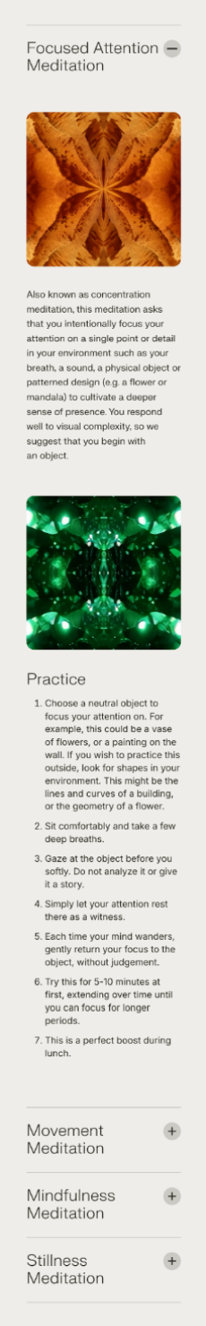 To create a cleaner layout for the four meditation sections, we implemented a responsive accordion. Initially, we explored a tabbed interface, but after evaluating the user experience, the team agreed that the accordion offered the most intuitive and visually organized solution. This approach improved content accessibility and maintained a streamlined design across devices.