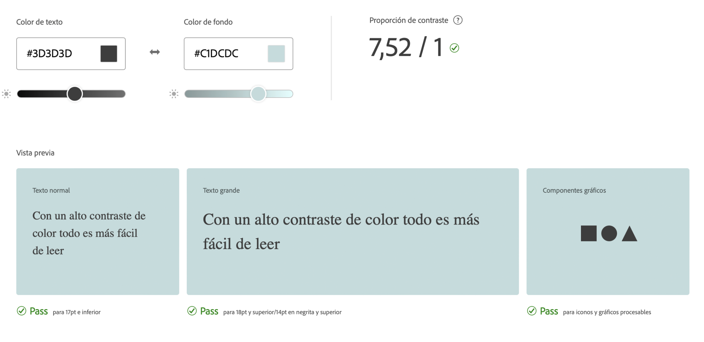 We analyzed the color contrasts through colour.adobe.com aiming for AAA, to make sure they are accessible to the majority of the population.